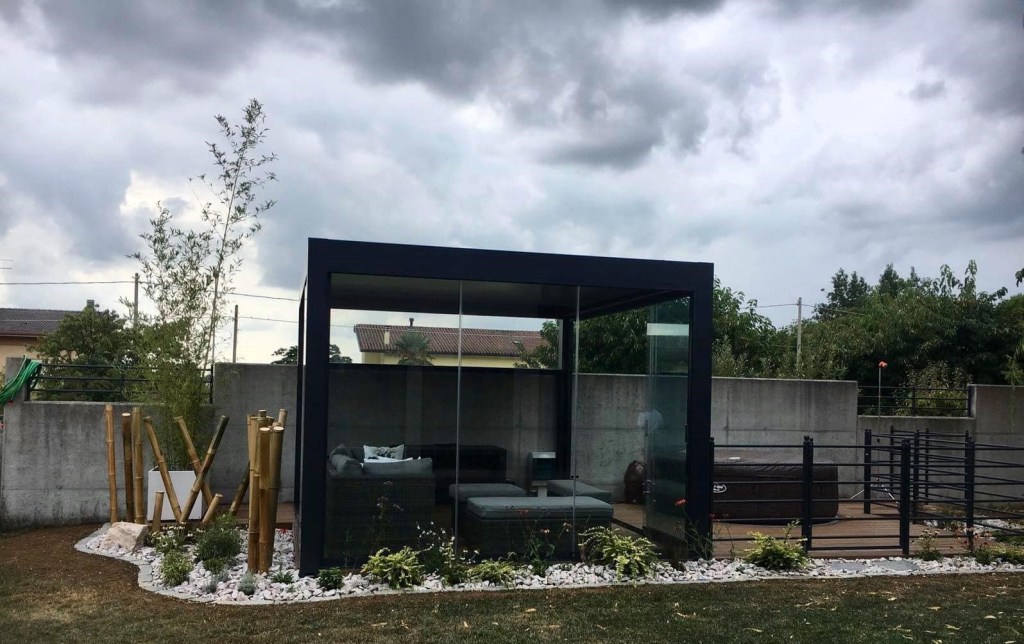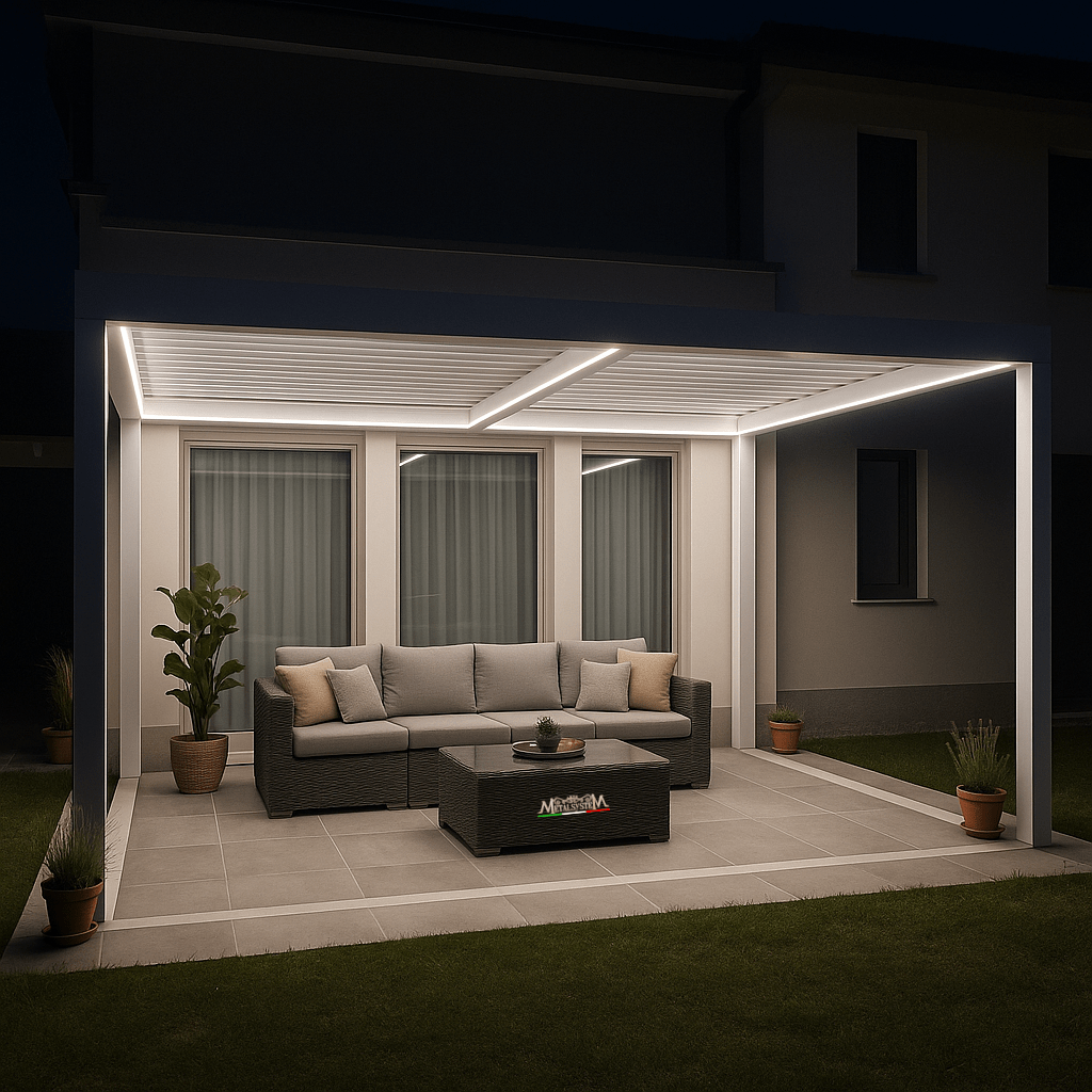 L’ambiente sottostante alla pergola è sfruttabile tutto l’anno, anche nei mesi più freddi, grazie alle chiusure perimetrali disponibili su richiesta. Di sera è possibile godersi degli ottimi momenti di relax illuminati dai faretti Led inseriti nelle lamelle della pergola.