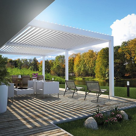 E’ una speciale tettoia studiata e progettata per proteggere e ombreggiare terrazze, patii, posti auto ecc. con il pregio di valorizzarlo al meglio. La particolarità della sua peculiare struttura a lamelle frangisole, orientabili con un angolo da 0° a 140°, permette sia di chiuderla completamente, sia di lasciar filtrare in modo modulabile la luce solare, illuminando gradevolmente gli ambienti sottostanti.
